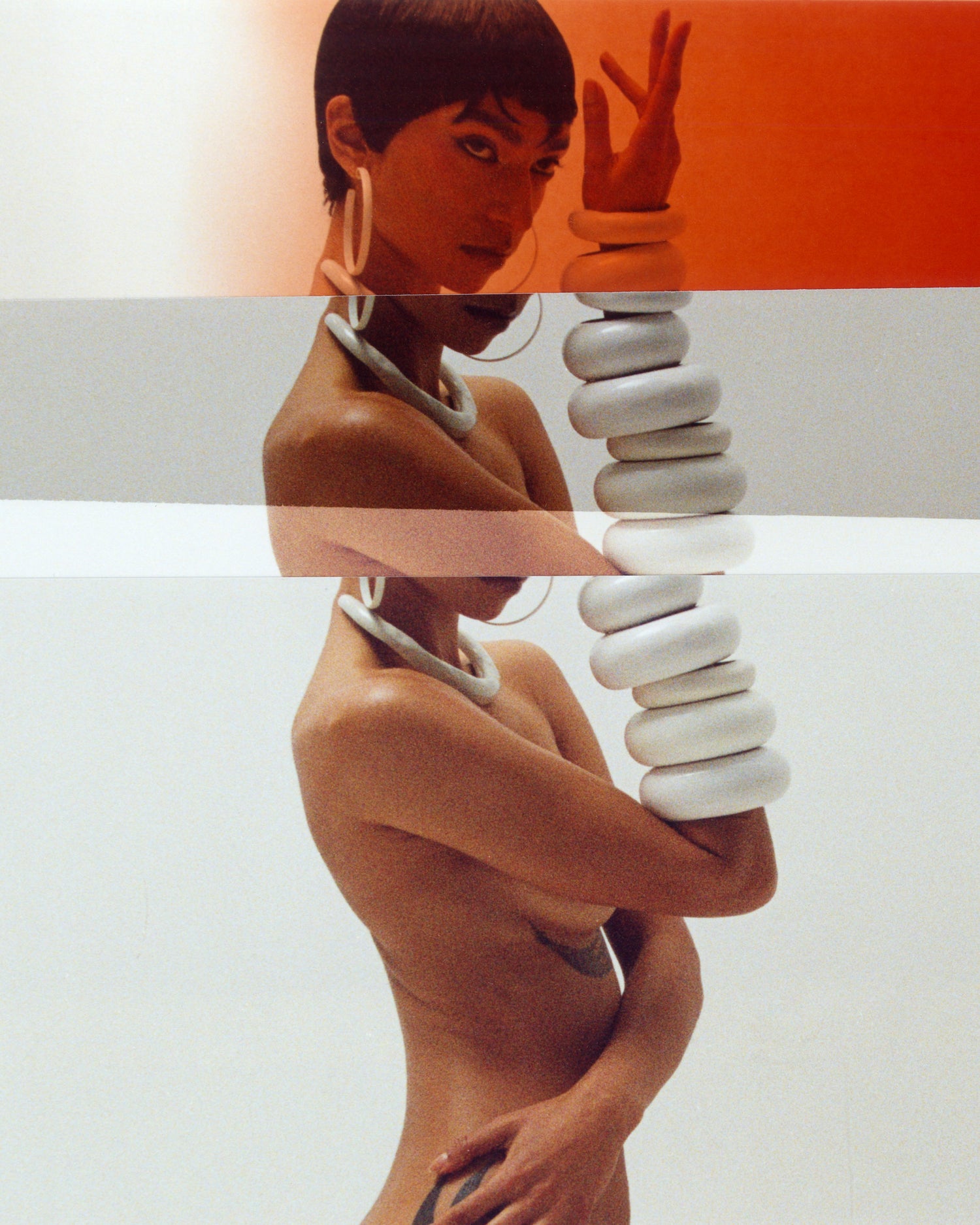 Tara wears a dress and arm piece by Caroline Zimbalist