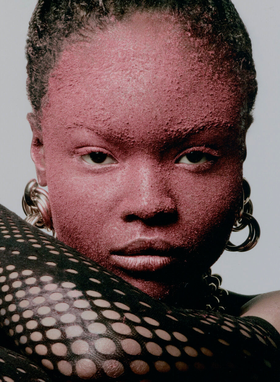 Noor wears hair suit created by hair stylist Takuya Yamaguchi, stylist’s own bra, stylist’s own tights by We Love Colors and archive shoes by RUI
