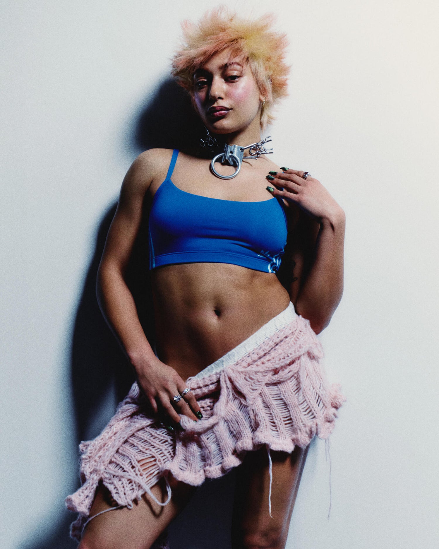 Lissy wears an Adidas bra from stylist's archive, a skirt by EsVenganza, a choker by Issy Salomon and their own earrings and rings
