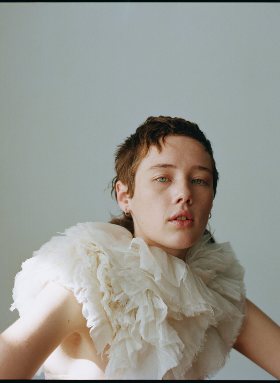 Annabelle wears a dress by Helmut Lang, bra and a harness by Ann Demeulemeester, all stylists own