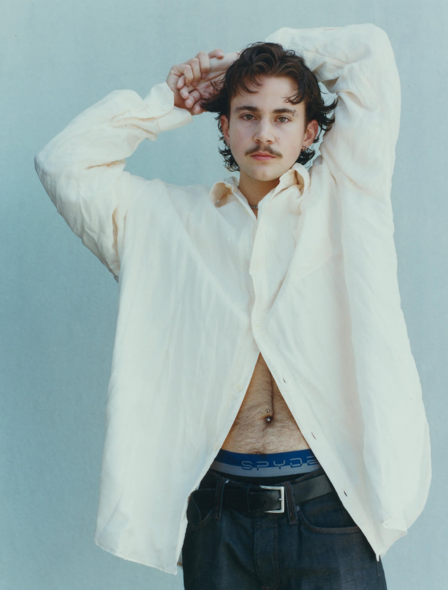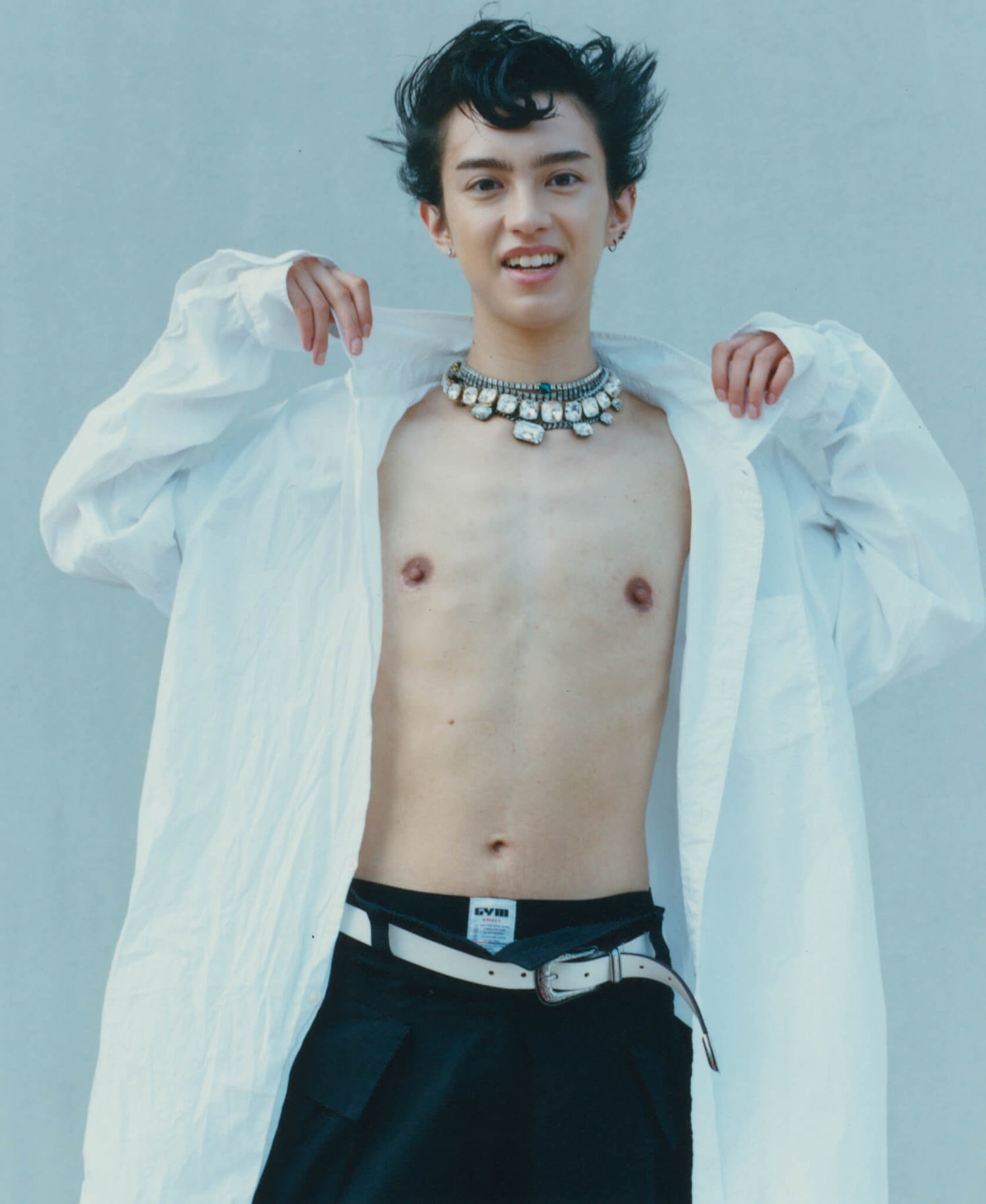Morgan wears an Our Legacy shirt from stylists’ archive, their own jeans, belt and underwear and a necklace by Janis Savitt from Albright fashion Library