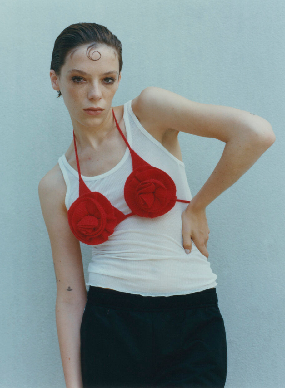 Ella wears a Magda Butrym knit bra from Albright Fashion Library, and a Calvin Klein tank and Adidas shorts from stylist’s archive.
