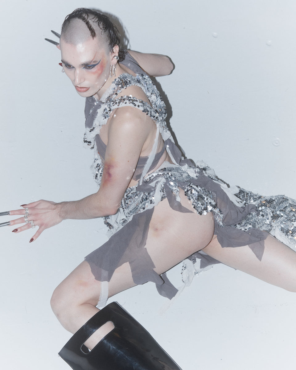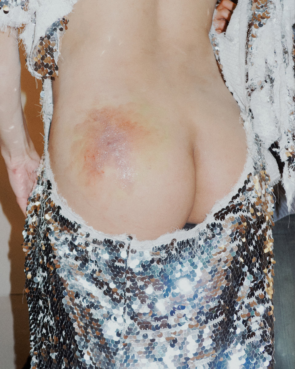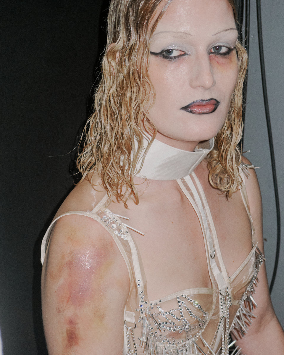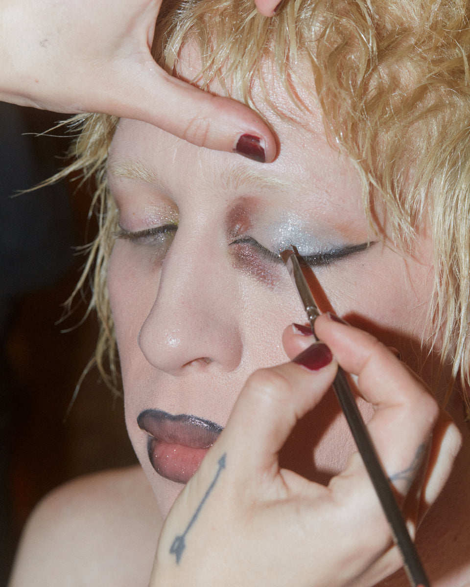 Submission Balm Shiny played a key role in adding high gloss on smokey eyes and lips. The other eye look had a heavy coat of the multifunctional Highlighter Lucid, lightening the lid while also setting a pressed layer of Glitter Dusted Silver. We also sprinkled Glitter Dusted Bronze for a bruised effect on different parts of the body and face, adding an unexpected touch of glam to something otherwise so severe.