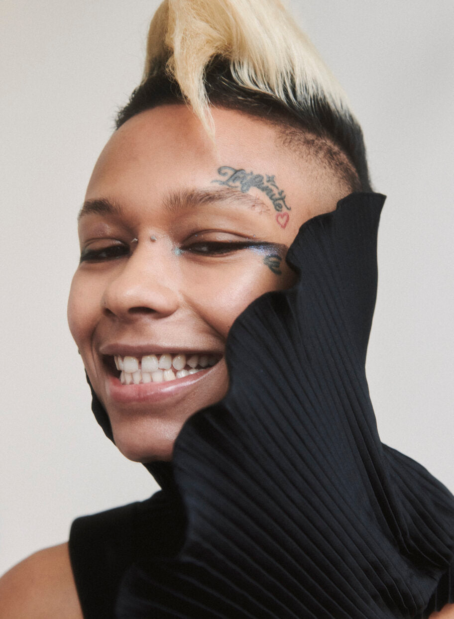 Euro wears a top and neckpiece by Balenciaga and bottoms by Yves Saint Laurent, all from Artifact NY, and earrings by Jasmine Sparrow