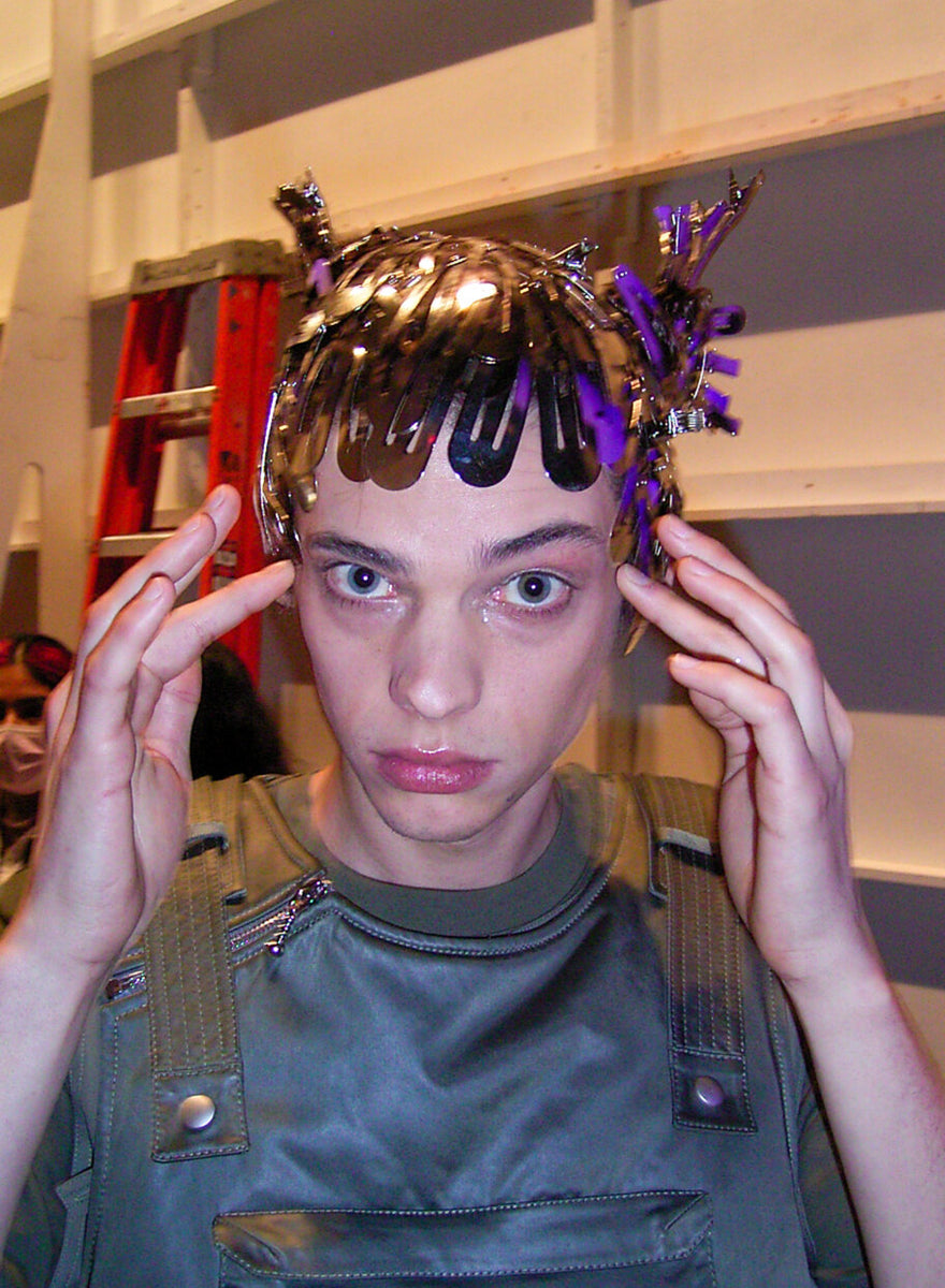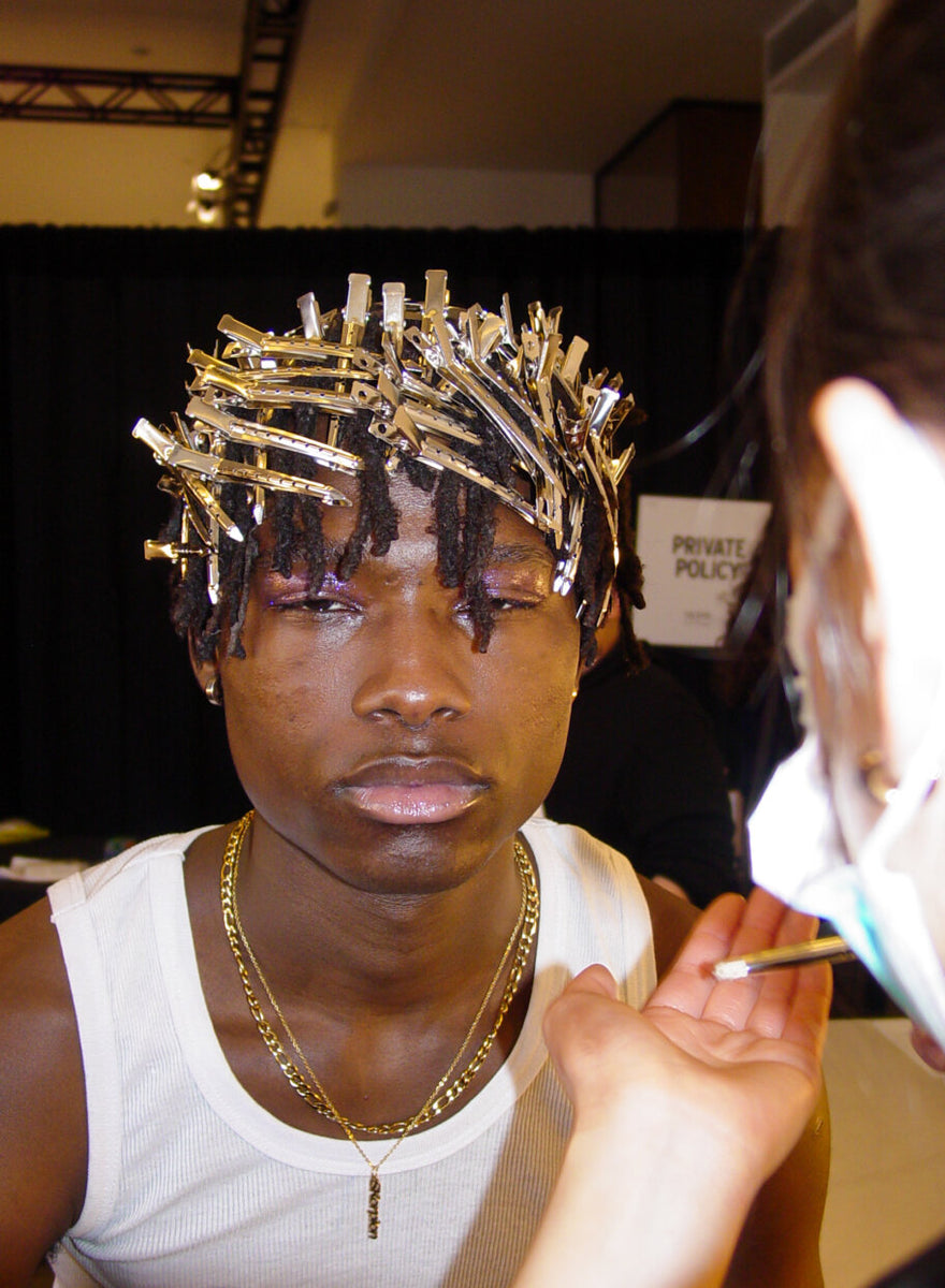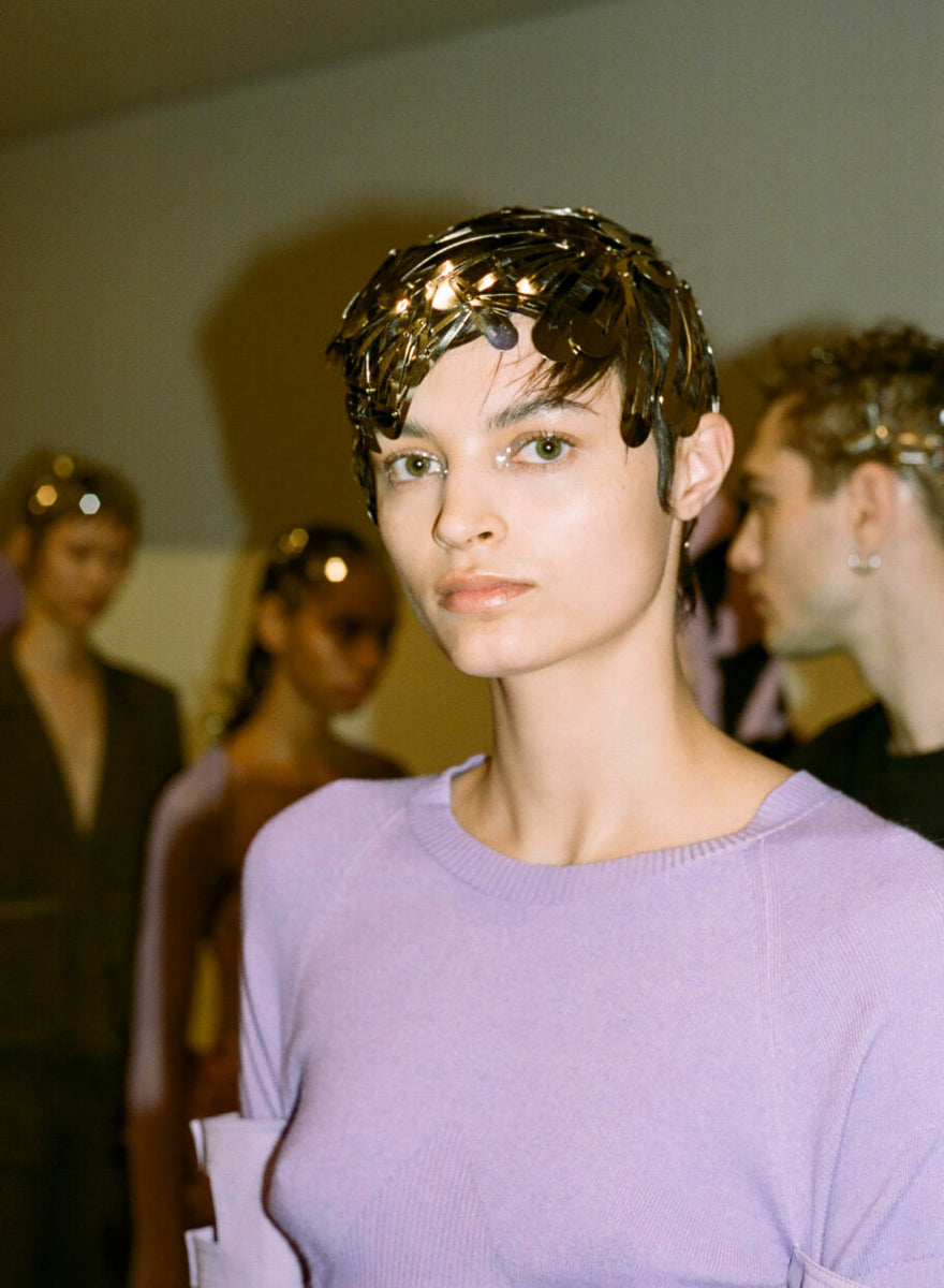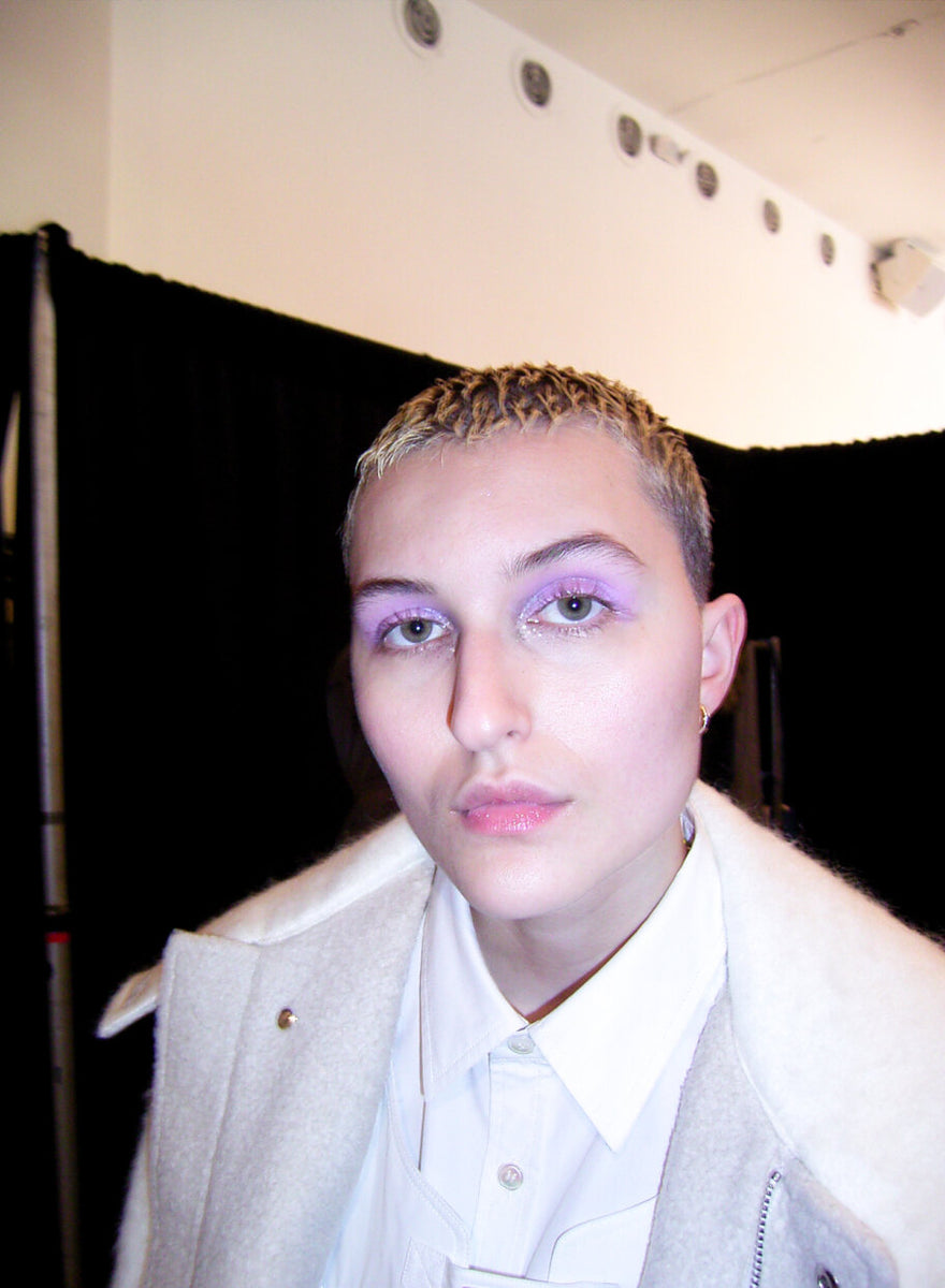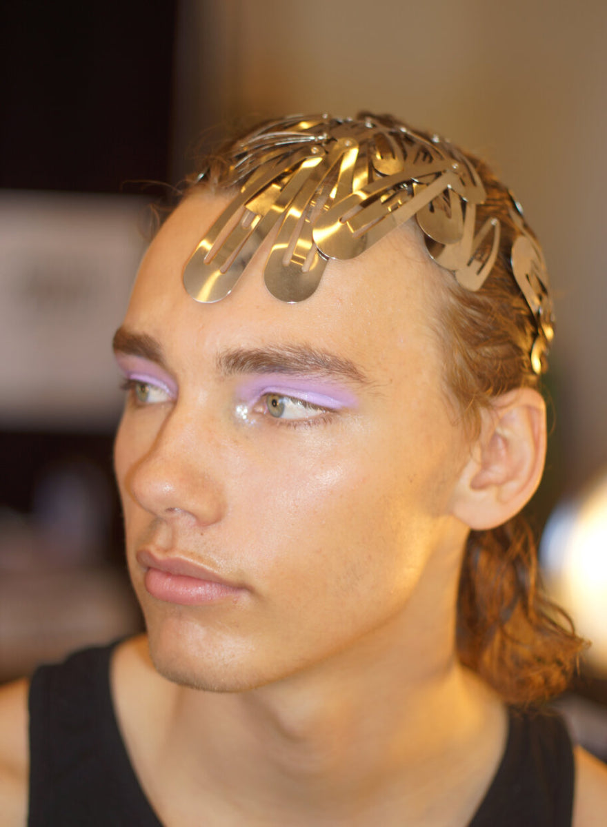 Submission’s own Zenia Jaeger looked to the brightest infusion of color in the collection, a signature muted lavender, to inspire the makeup look for the season. Using the multi functional Shiny Balm, a new Submission Beauty product to be released later this year, she freshened up eyelids, cheeks and pouts on a stellar cast of models, mixing in various amounts of violet pigments to perfectly complement the collection.To top off the look, each model had a sprinkling of our signature biodegradable Submission Beauty Glitter in silver, a shining pop to compliment the metallic hair styles and details in the collection.