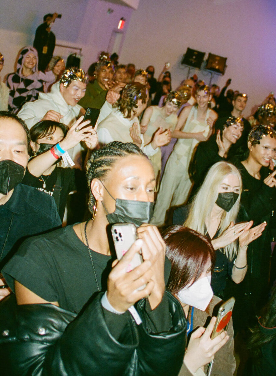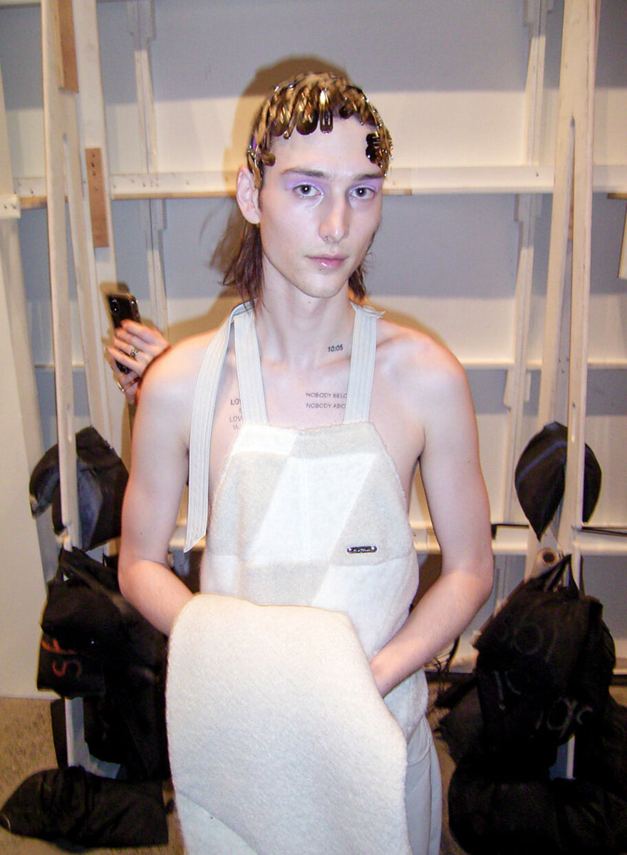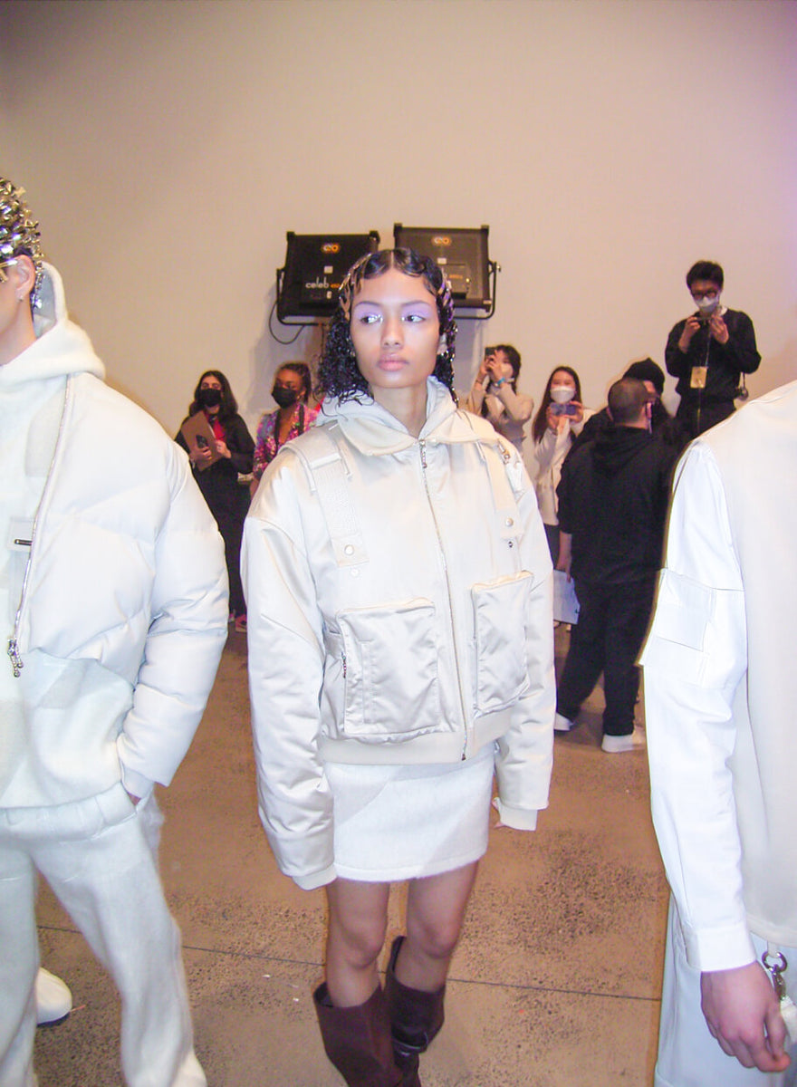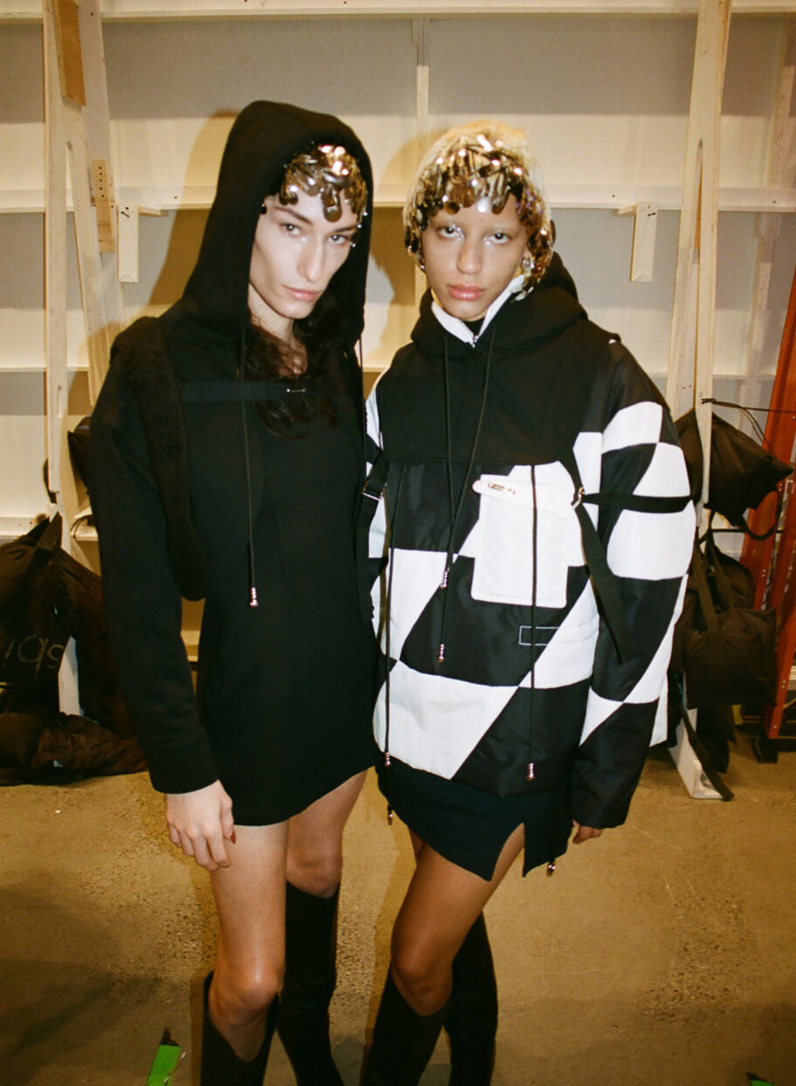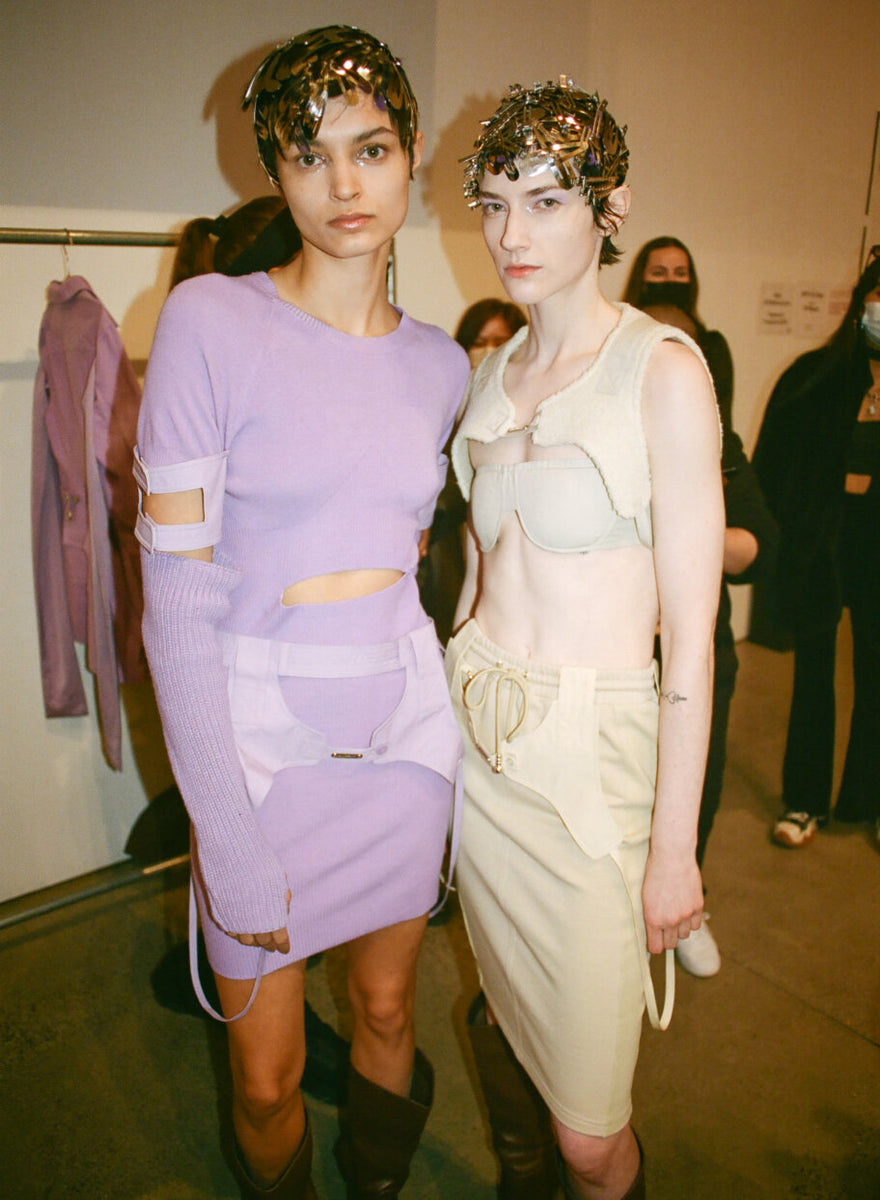 Never shy to look in unusual places for inspiration, Private Policy found themselves fascinated by mushrooms this season, dissecting documentaries and studies on the subject for their most recent collection “Organic Futurism”. Taking cues from the color palette of the funghi universe, they showed a utilitarian-minded collection – always a strong inspiration for the Chinese-American brand – with straps, harnesses, cargo pockets and multiple practical details. An exciting new material was introduced this season, the designers finding a way to make signature keychains from a leather-like material, made from dehydrated mushrooms. A first for Private Policy, shoes are now on offer: a highlight being the booties resembling surgical covers, produced via 3D molds from zero-waste foam. A perfect example of the designer’s ability to combine sustainable and forward-pushing technology with humor. The PP customer, often described as clubkids with a heart and fondness for sustainability, will have plenty of eccentric options for both late night raves and a well dressed foraging trip in nature.