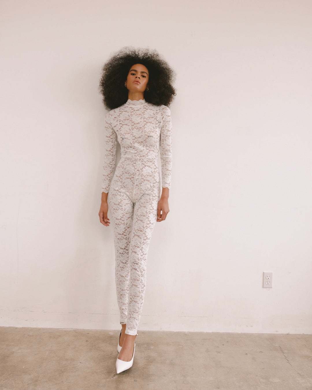 Mika wears a catsuit from Kim Shui, as well as archive earrings and shoes from Biblioteq